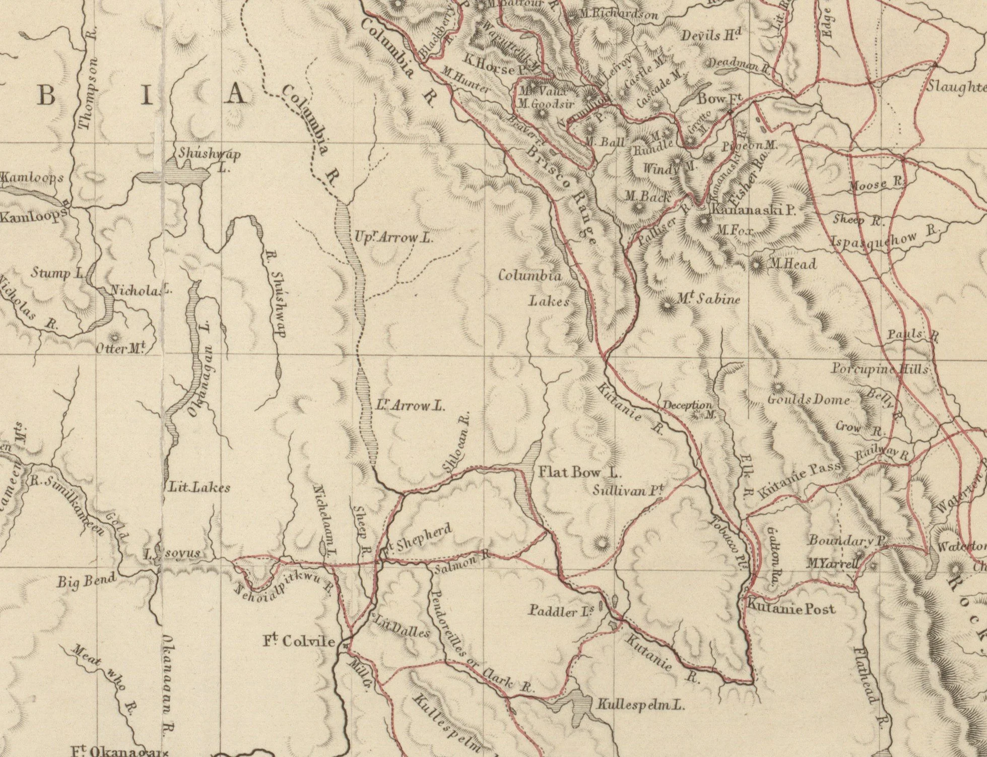 Following the route Palliser had mapped, Dewdney’s trail was forced north, eventually reaching the southernmost point of Lower Arrow Lake (a route was later found to avoid this northward loop). From Arrow Lake, Dewdney had two ideas for the trail’s route; the first of these two paths followed the edge of Kootenay Lake, which Dewdney followed on canoe, searching for a suitable crossing place. However, Dewdney wasn't able to find any way around the lake, and to instead take a more southerly route, passing around Kootenay Mountain and ending at the base of Kootenay Lake. In finding this route, Dewdney relied heavily on the knowledge of local Indigenous peoples who acted as guides and packers, showing him the ways through the mountains and helping his team carry the necessary food supplies and trail-building tools on their journey.