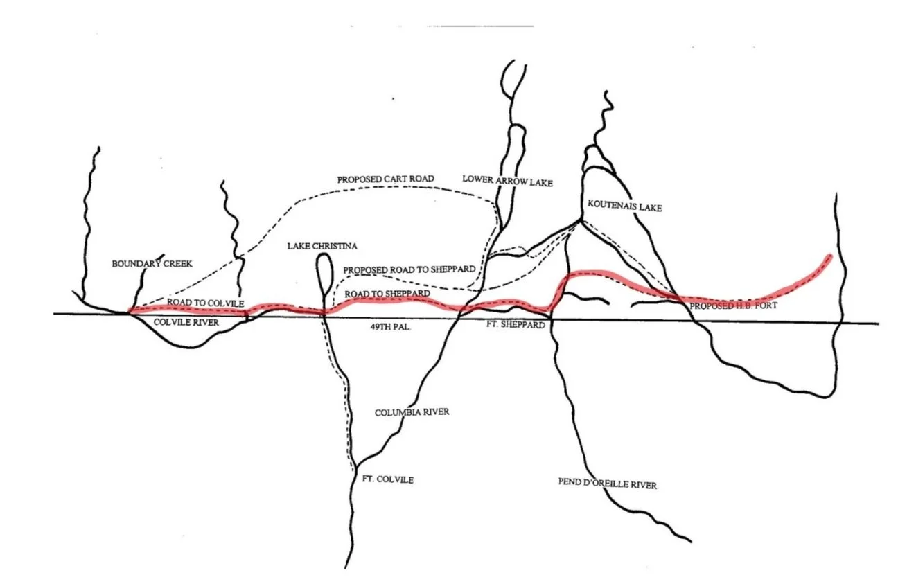 In an 1896 interview with the Rossland Miner, Dewdney – discussing the labourers he employed for the construction of the trail – states that he had employed a “large force of Indians employed as packers and guides” and that in his early reconnaissance for the trails route he came through “Lower Arrow Lake… with an Indian guide.” Although Dewdney doesn't identify which Indigenous groups these guides belonged to, his guides in the Kootenays were most likely the same Sinixt and Ktunaxa people whom Palliser had employed just years before. After Dewdney had reached the base of Kootenay Lake, the Trail was able to wind its way through the easy mountain passes charted by Palliser, before reaching its end point: a ferry crossing along the Kootenay River, just eight kilometers from Fort Steele.