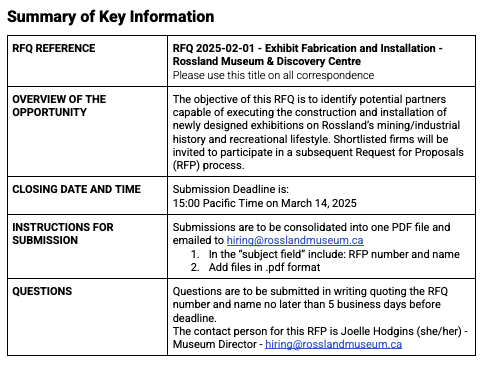 Proposals must be received by the Rossland Museum & Discovery Centre by 3 pm Pacific Time, on March 14th, 2025.