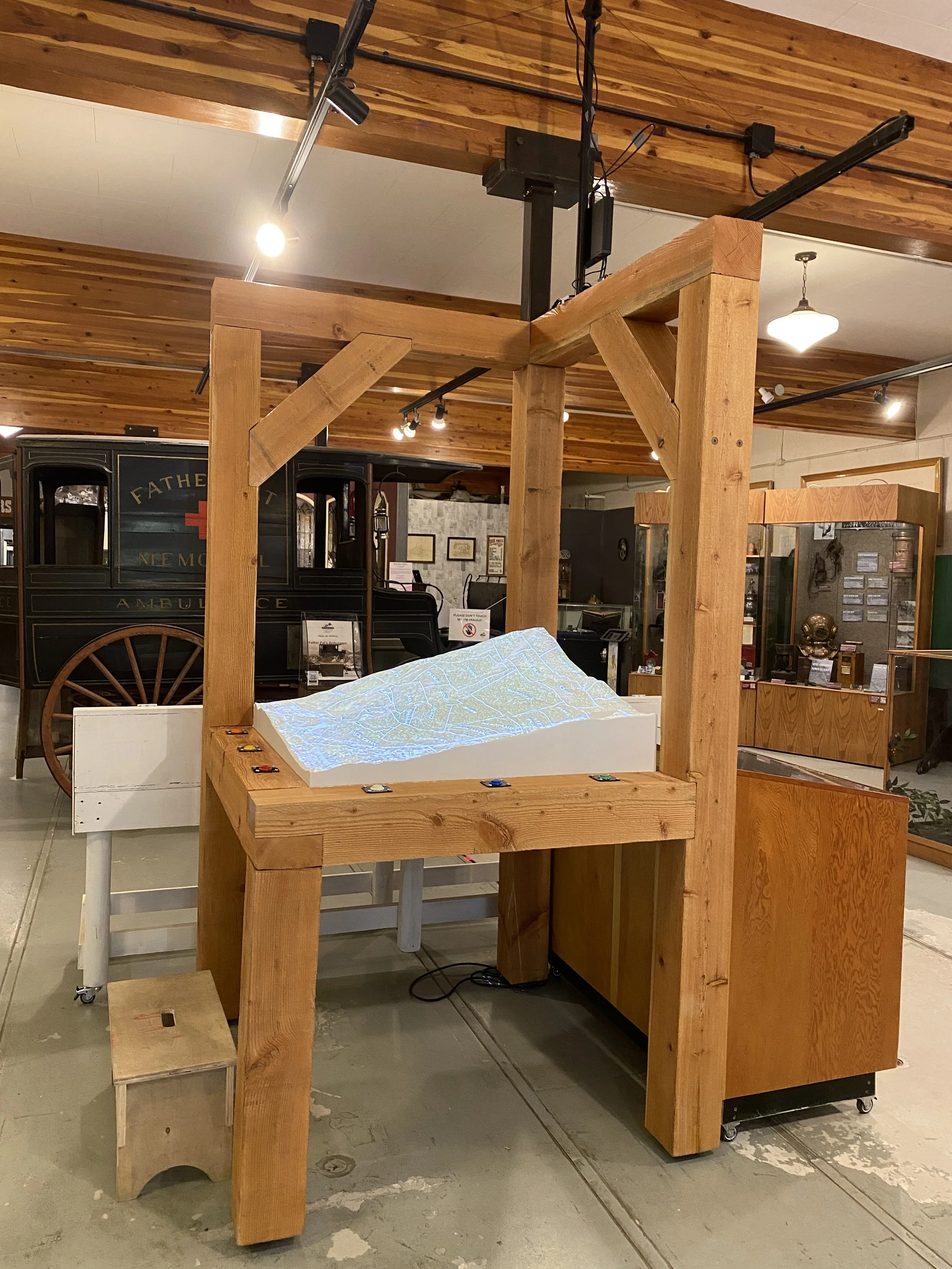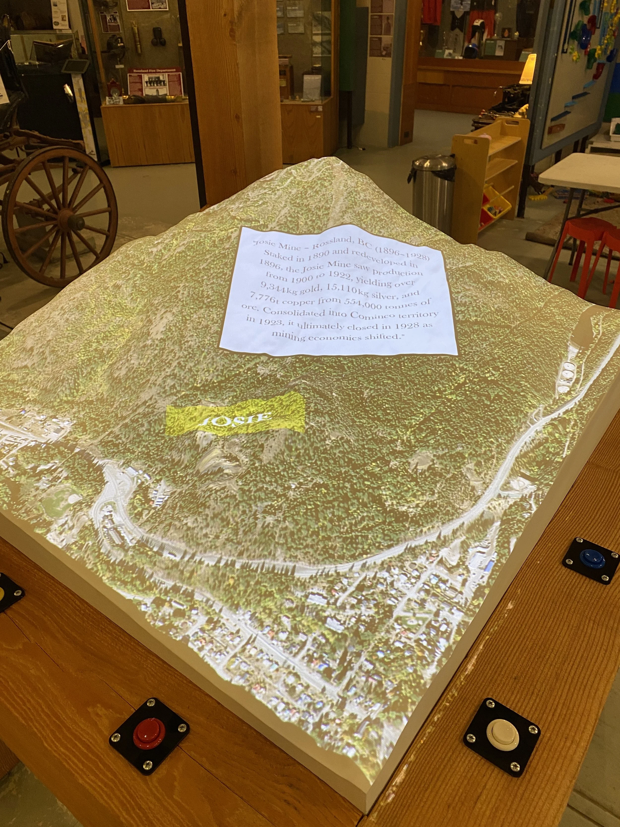Through the use of a 3D topographical version of Red Mountain and a projector, visitors will be able to interact with the mining history in ways they haven’t before. The large timber frame was inspired by and mimics the timber headframes that used to decorate the mountain. Visitors can press different buttons to bring up different maps and information about the mines that were so foundational for our area. The map display is the first step in replacing a previous exhibit that used glass slides to display the mine tunnels. It will eventually showcase the depth and breadth of the mines that produced over 97% (83.6 million grams of 86 million grams) of the gold from the Rossland mining camp.